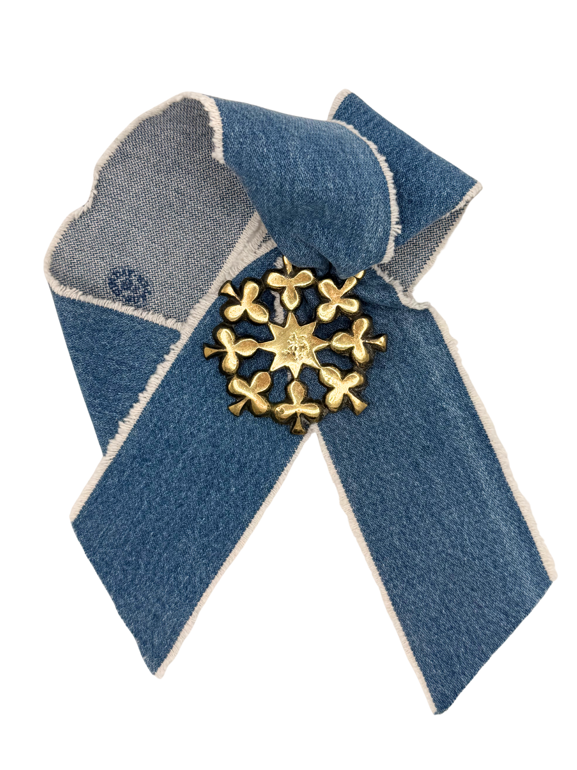 Vintage horse brass medallion + Twilly scarf made of vintage Wrangler denim. Eight point star with shamrock surround.