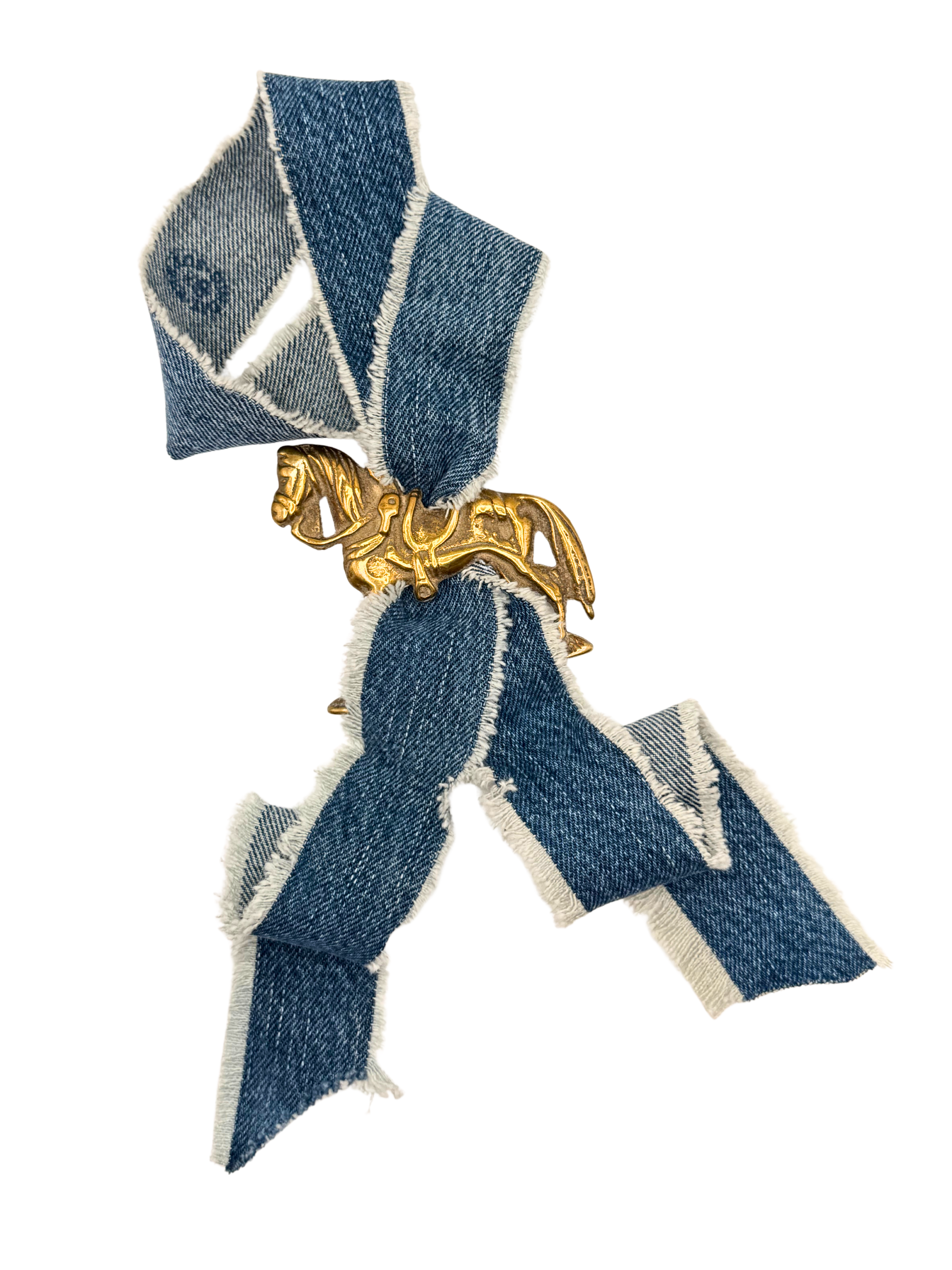 Vintage horse brass medallion + Twilly scarf made of vintage Wrangler denim. Full body profile of horse facing left. Unique piece in that it's not circular.