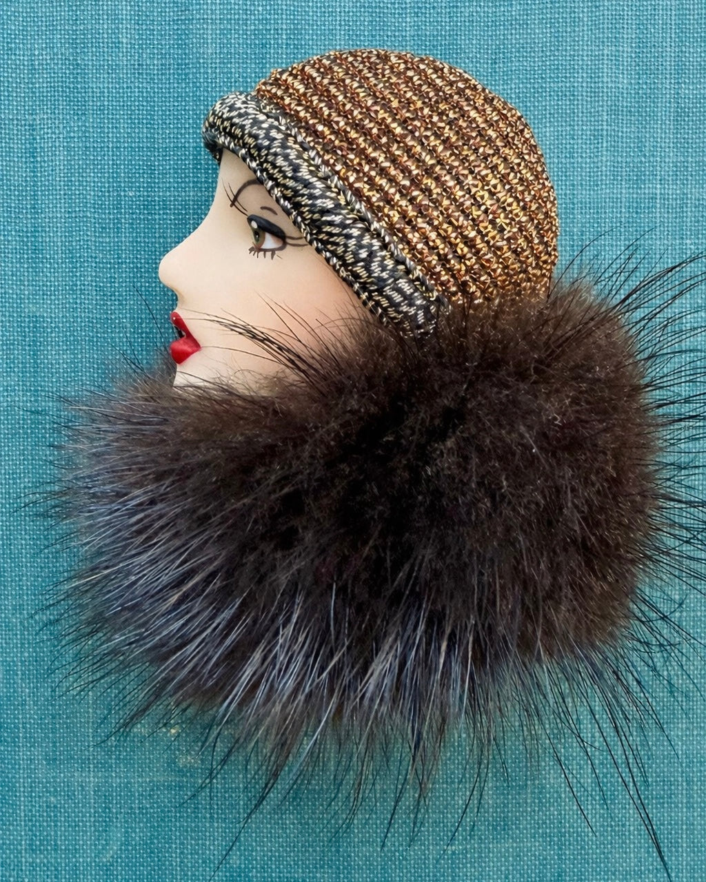 She is clearly dancing with Zelda and F. Scott tonight. This flapper brooch has a tuft of mink and a beaded turban and she's ready for whatever the evening brings her.