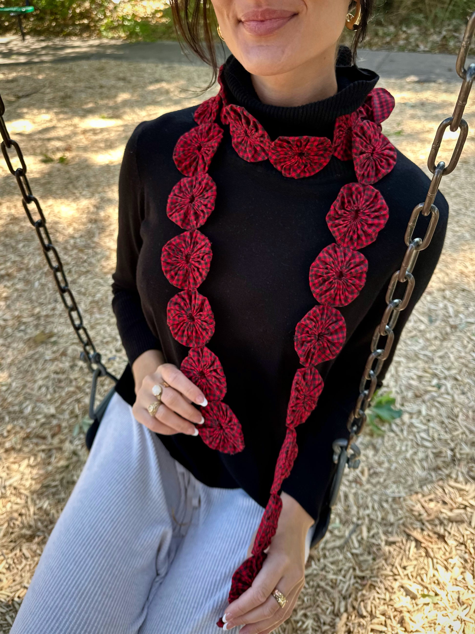 These long, skinny scarves are made from vintage yo-yo quilt pieces. The textiles are in a variety of colors of feedsack fabrics, largely from the 1920s to the 1960s. Each scarf has been individually arranged and stitched together, making each one a true one of a kind.